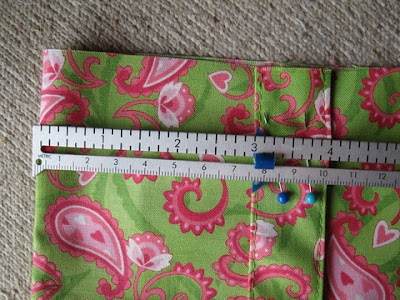 On the RIGHT side of the outer fabric, you'll place the crayon pocket 5 1/2" down from the top. Pin in place. Sew along each drawn line - make sure to start with a few stitches at the top of the pocket, backstitch a few stitches to above the pocket, sew normally down to the bottom of the pocket, backstitch a few stitches, forward stitch a few stitches.
