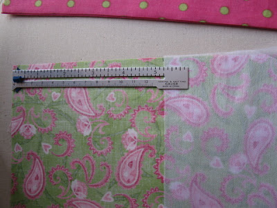 Fold the fabric in half widthwise (making it 12 1/2" (14.5") x 14 1/2") with RIGHT SIDES together. Toward the center of one of the side edges, place two marks 4" apart. This will create an opening for the bag to turn it right side out when you're done sewing.