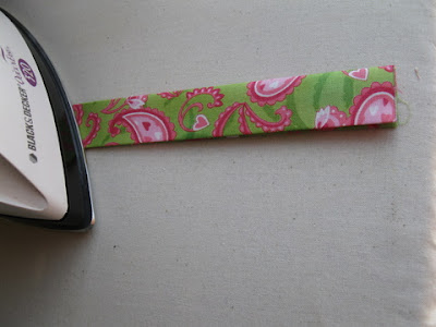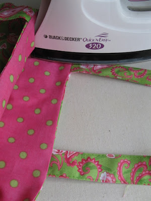 Take 1 piece of the strap fabric and fold it in half lengthwise with WRONG SIDES together and iron (making the piece 2" x 20").